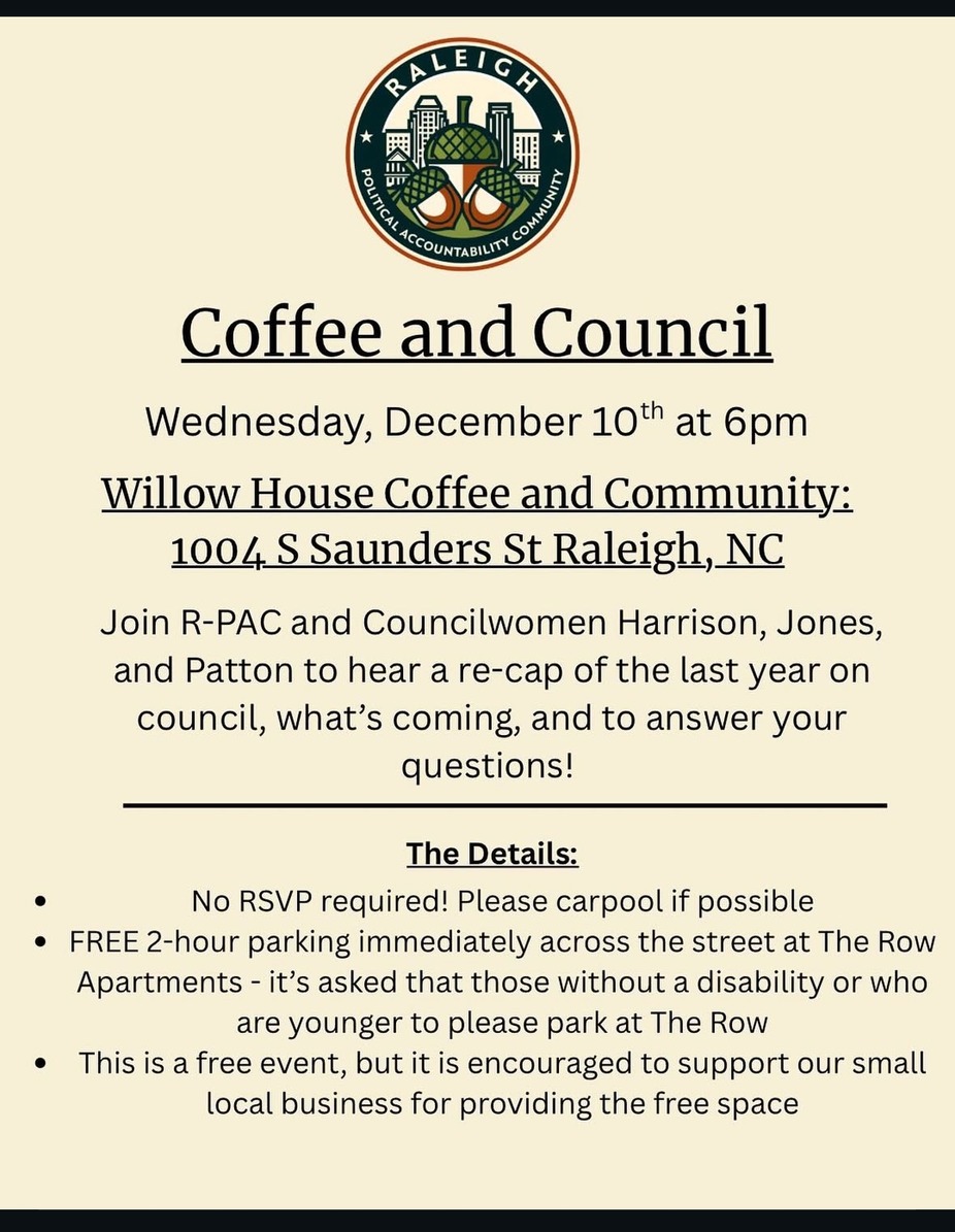 Join R-PAC and Councilwomen Harrison, Jones, and Patton to hear a re-cap of the last year on council, what's coming, and to answer your questions!