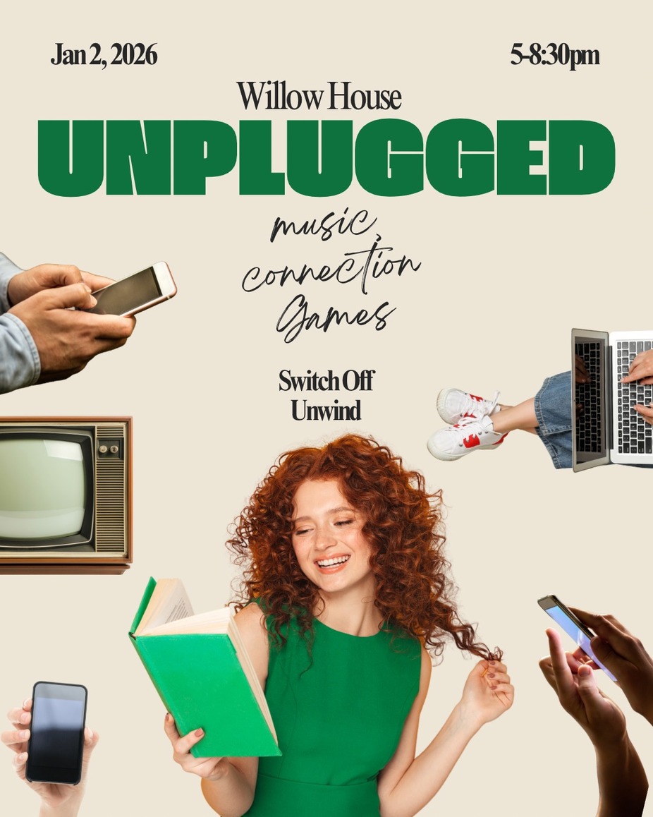This is something to look forward to! 👀 After the dashing and dancing from Holiday fun….like most of us, you may need a little slowing down. 🧘♂️ Let’s switch off & connect at Willow House Unplugged - a cozy evening of crafts, books, games, music & conversation. A calm space to relax and be present to the moment. No screens!…Just creativity, laughter & real connection.